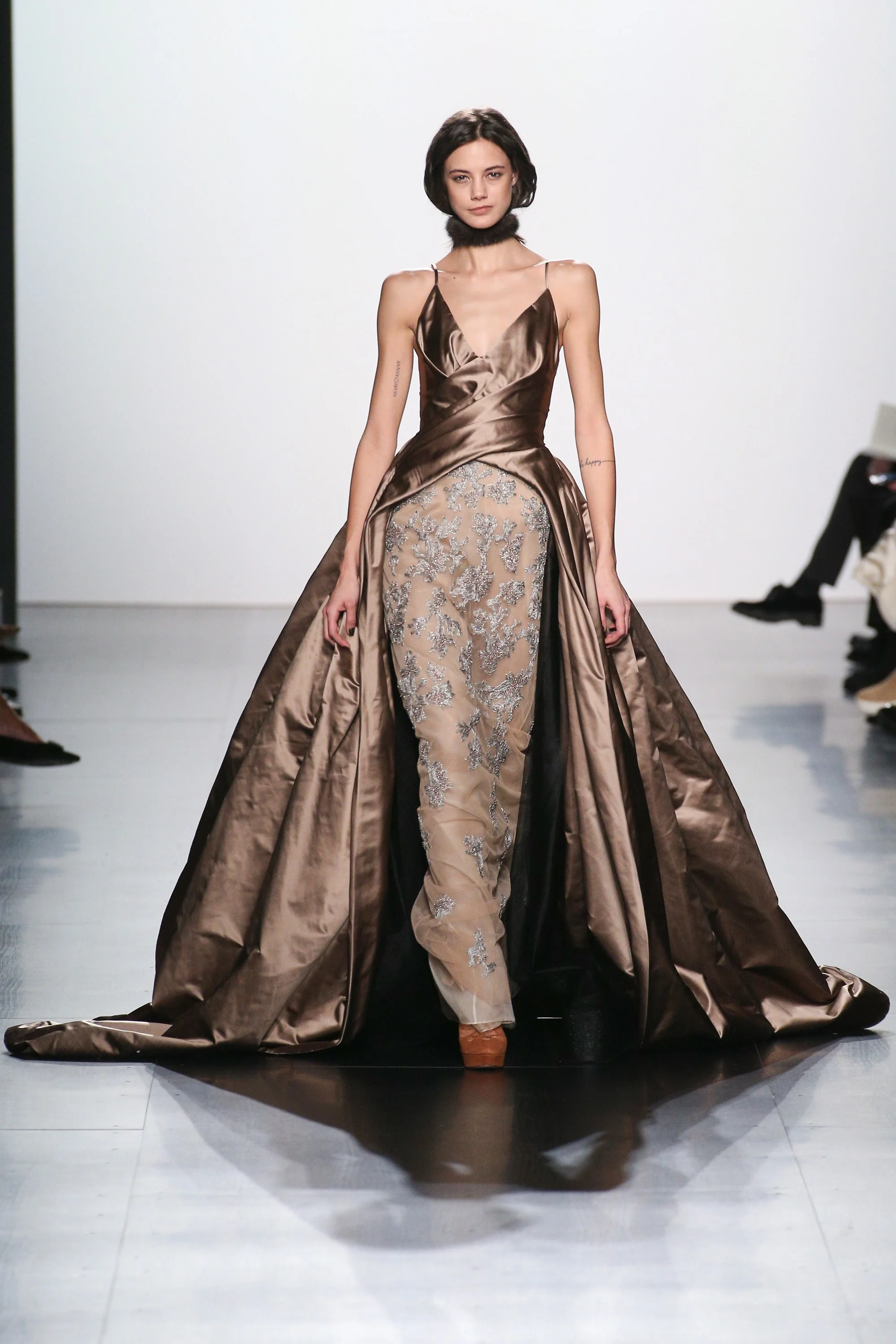 At Dennis Basso where Tiffany Trump attended with her friends and bodyguards, this finale of taupe could cross over from red carpet to an independent formal bride.