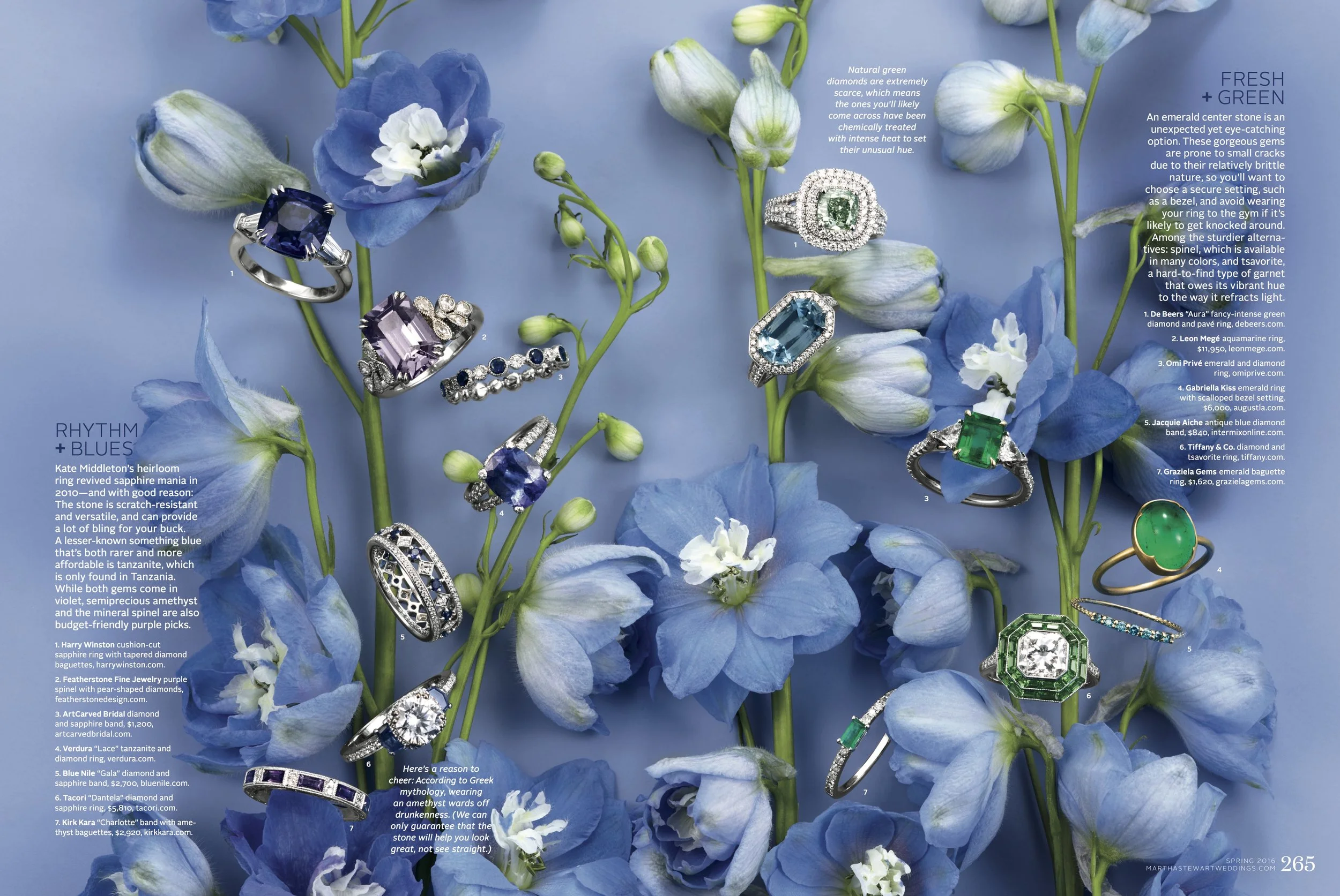MANY OF OUR READERS COME TO US BEFORE THEY ARE ENGAGED, WHEN THEY ARE DREAMING OF AND RESEARCHING ENGAGEMENT RINGS. ROUND-CUT DIAMONDS IN WHITE GOLD OR PLATINUM SETTINGS ARE CLASSIC, AND STILL TAKE TOP PLACE IN TERMS OF POPULARITY. BUT YELLOW GOLD AND ROSE GOLD DEFINITELY HAVE THEIR FANS. EAST-WEST SETTINGS ARE A VERY COOL NEW TWIST ON THE TRADITIONAL. ONE THING THAT’S FOR SURE: OUR BRIDE KNOWS WHAT SHE WANTS AND DOES NOT WANT HER BOYFRIEND GUESSING. JEWELRY PARTNERS OFTEN TELL US THAT THE GROOM COMES INTO THE STORE WITH HIS GIRLFRIEND’S MARTHA MAGAZINES TO SHOW THEM THE EXACT RING SHE HAS “HINTED” SHE WANTS!