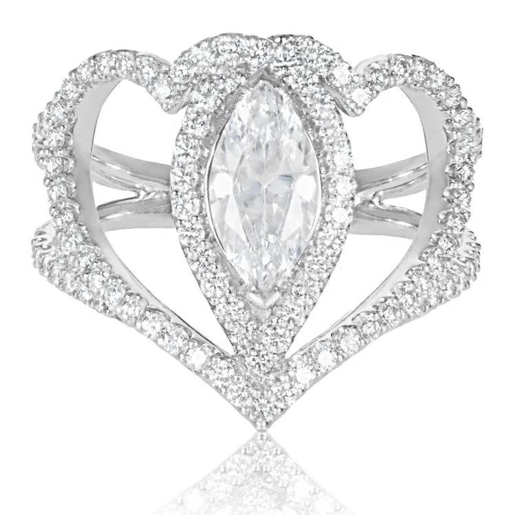 Limited edition platinum ‘Les Coeurs Entrelacés’ engagement ring with a marquise diamond center stone flanked by diamond-encrusted hearts.