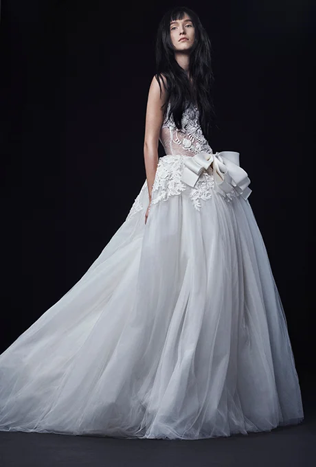 THE LINGERIE TREND FINDS A NATURAL PLACE IN THE WORLD OF WEDDING DRESSES. CASE IN POINT: THIS SPLENDID GOWN’S SHEER BODICE, STRATEGICALLY POSITIONED LACE PANELS, AND SENSUAL SATIN ACCENTS. THE PENDULOUS WAIST BOWS ADDS A MAD DASH OF ROMANCE, WHILE THE FULL SKIRT IS BALANCED BY A SNUG CHANTILLY LACE BODICE.