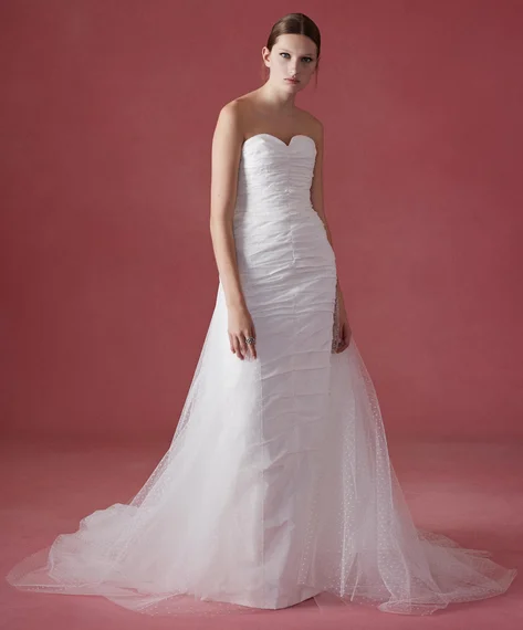 AS FLATTERING AS IT IS ROMANTIC, THE SWEETHEART NECKLINE IS A FAVORITE WITH BRIDES; PAIRED WITH A TAFFETA-RUCHED COLUMN AND HAND-DRAPED POINT D’ESPRIT OVERLAY GOWN, THE EFFECT IS SEXY-SWEET SOPHISTICATION.