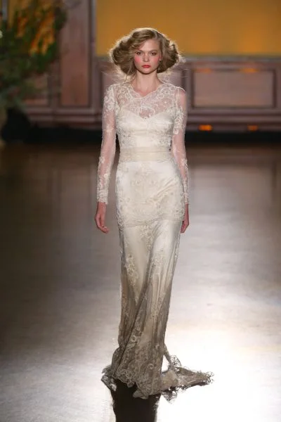 SMOOTH POUR OF VINTAGE-STYLE CHANTILLY LACE CARESSES A SENSUAL COLUMN OF SATIN. THE LONG LACE SLEEVES, WARM TONES OF PEARL AND IVORY, AND ELABORATE ROSE-GOLD EMBROIDERY PAINT A NOSTALGIC PICTURE THAT WOULD BE STUNNING IN A GILDED ERA MANSION—OR ON THE DECK OF A CLASSIC YACHT.