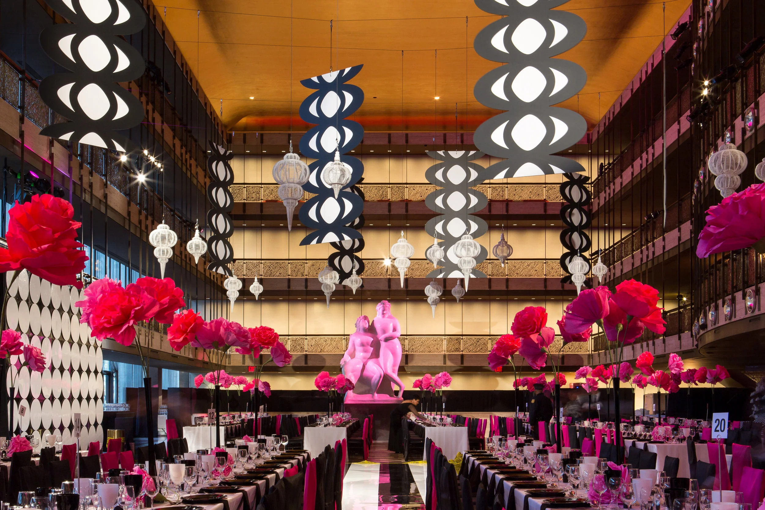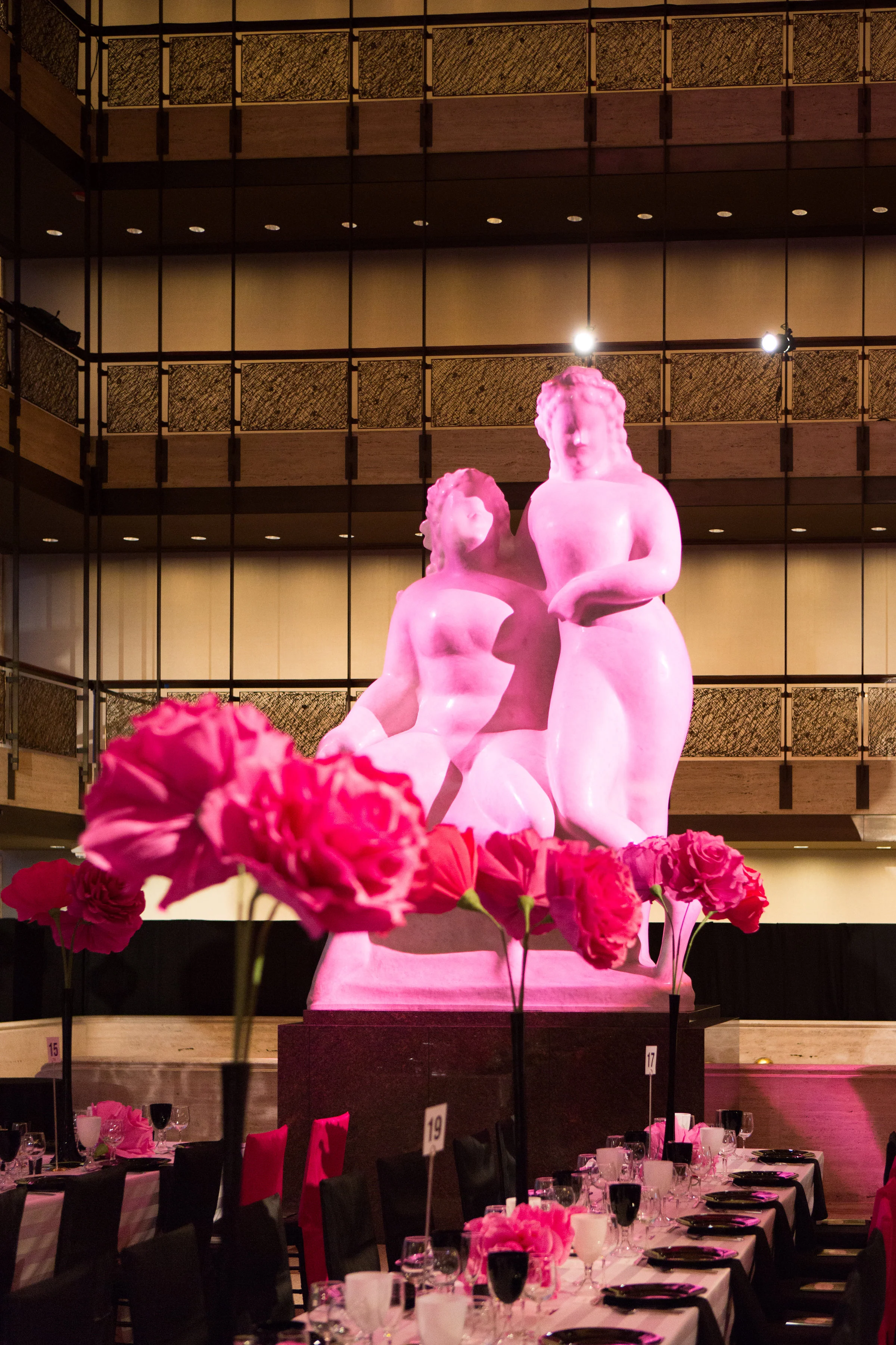 Considering the venue and its lighting, we knew we needed more than just black and white to carry the evening. We needed a vibrant punch color to electrify the room - Hot Pink would serve us well. As a floral designer I knew that pink flowers alone as beautiful as they are would not be enough to respond to our venue's soaring ceilings. We allowed ourselves to think big and go beyond the scale of normal flowers and created a prototype of giant Italian crepe paper" poppy roses" on four foot long stems which we knew would animate the room with its dynamic backdrop of our black and white striped dance floor and over scaled patterned mobiles overhead. The adage "Go bold or go home" was never more true.