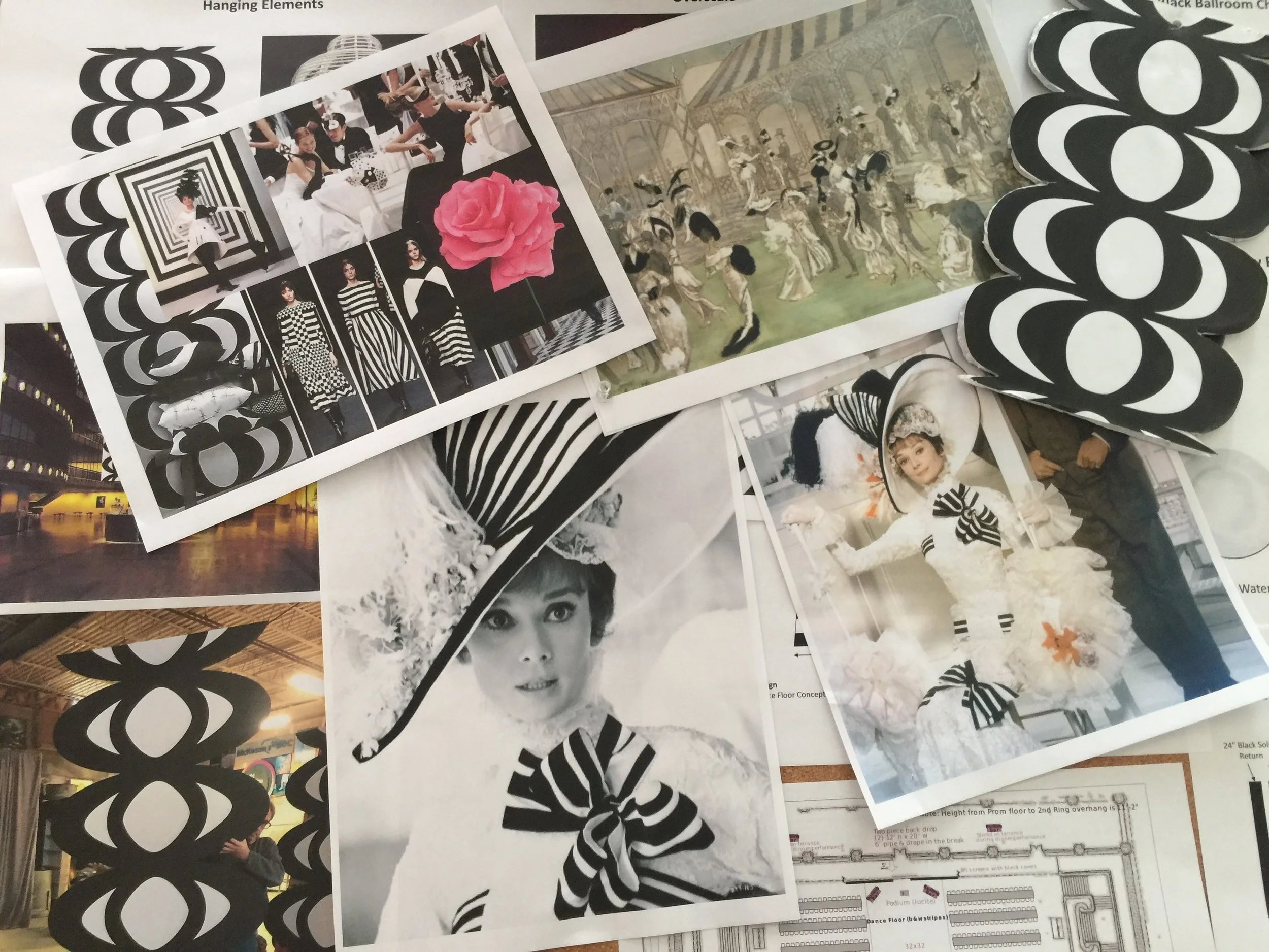One rainy Sunday afternoon watching films on TV I became engrossed in an old favorite classic film " My Fair Lady ". Mid way through the film there is an amazing highly stylized scene at the Ascot horse race. The set was design by the famous fashion photographer, Cecil Beaton. The actors costumes were all black, white and grey, in an equally black and white environment. Though Edwardian in style, it was remarkably modern and so graphically powerful. The next day at work I noticed two magazine covers where the model and celebrity were wearing black and white striped dresses - Hmmmm...Is this a sign?? It seemed like the perfect starting point and the ideal backdrop concept.