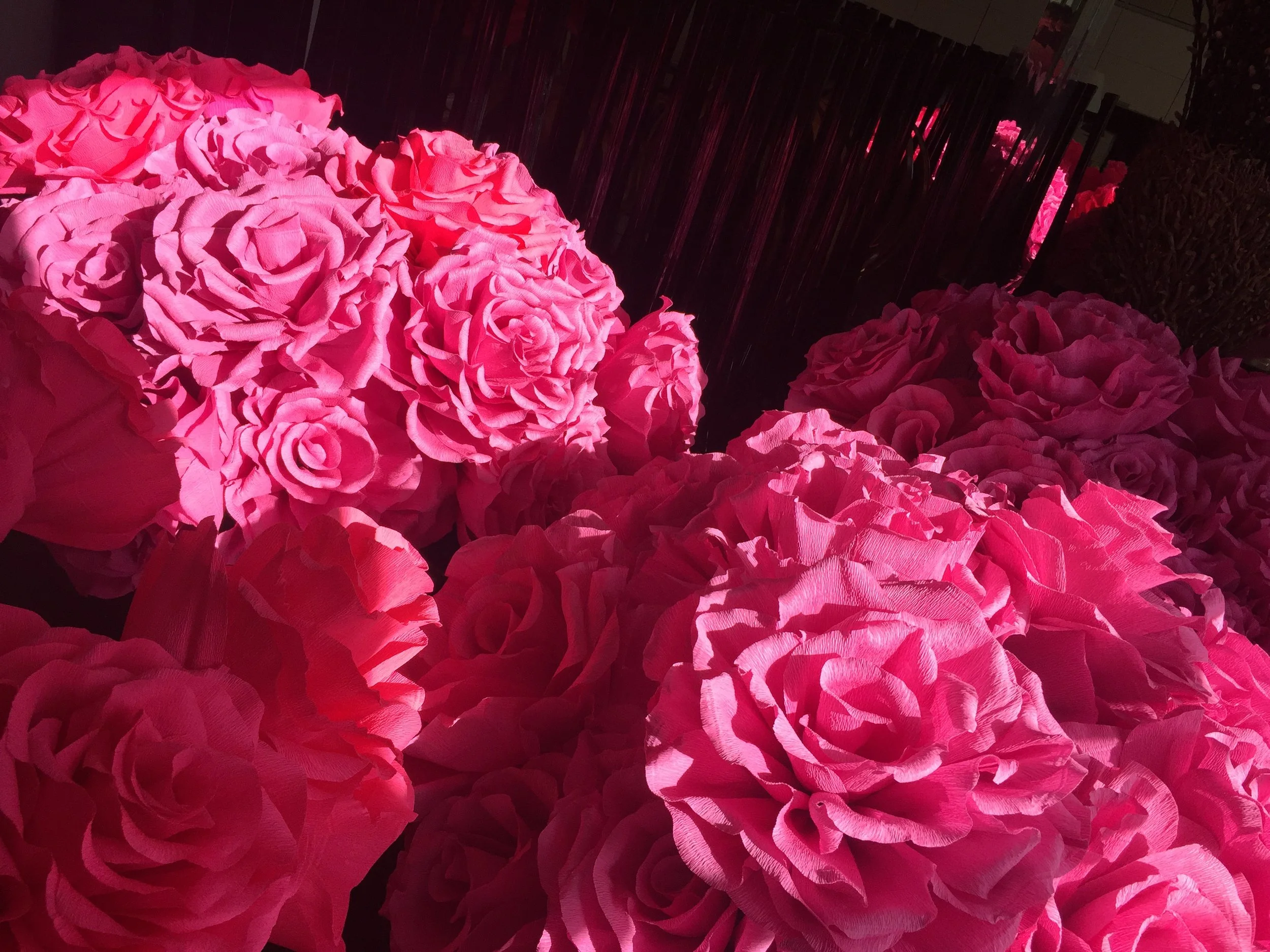 The night of the gala, the looks of wonderment on the guest's faces as they encountered something completely unexpected in a room they had all been in a thousand times was so rewarding. It was as if they were walking through a field of giant flowers. The 14" wide paper flowers caught the light streaming down beautifully and illuminated each as if they were lit from inside. That is what we strive for, that one moment when, the partygoer is lifted from their daily routine to stop and notice.