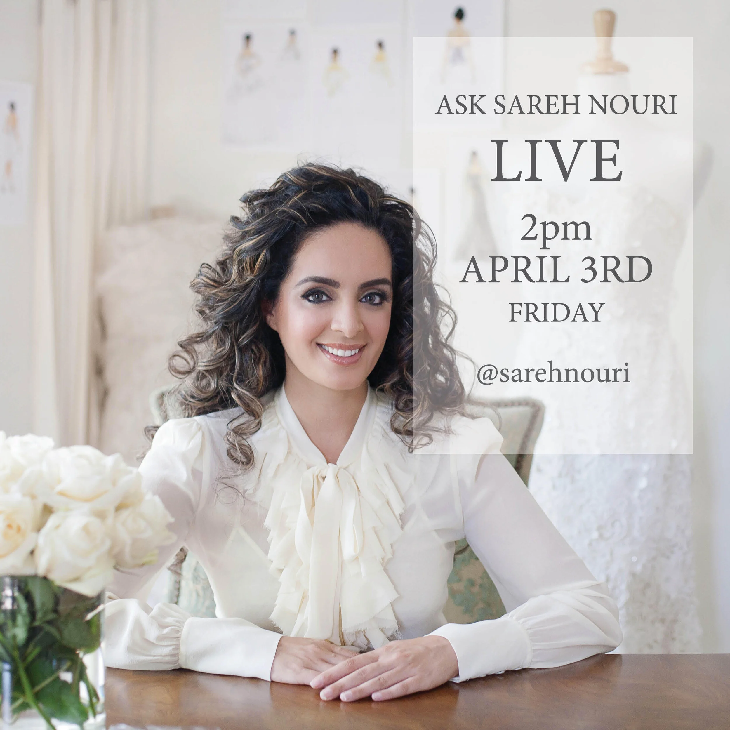 Due to an overwhelming number of questions about the state of the bridal industry amid COVID-19 concerns, designer Sareh Nouri will be hosting a live Q&A via Instagram on Friday, April 3rd at 2pm. This is a unique opportunity for brides and grooms-to-be to get advice from an industry expert. If you or anyone you know has questions regarding the bridal industry, we encourage you to participate in this open forum.