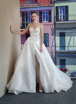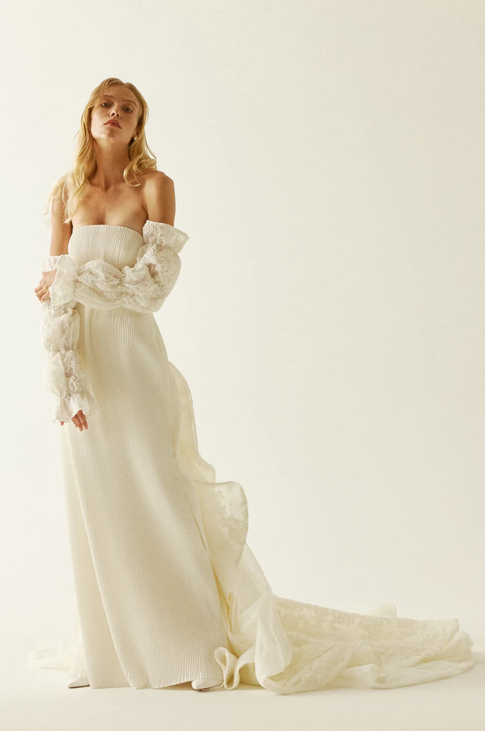 Minimalistic styles, an interest in veils ushered in by Meghan Markle and references to the ‘70s and ‘80s, proved that individualism reigned on this season’s runways. Jumpsuits, fancy bridal suits and track suits continued to turn heads, as well as sweeping sleeve treatments, attached and unattached. Multi-layered skirts and gowns with textured lace appliqués and embroideries were accented with plenty of bows and sparkle. As the dramatic ball gown lightened up with barely a crinoline insight, metallic laces made their return.